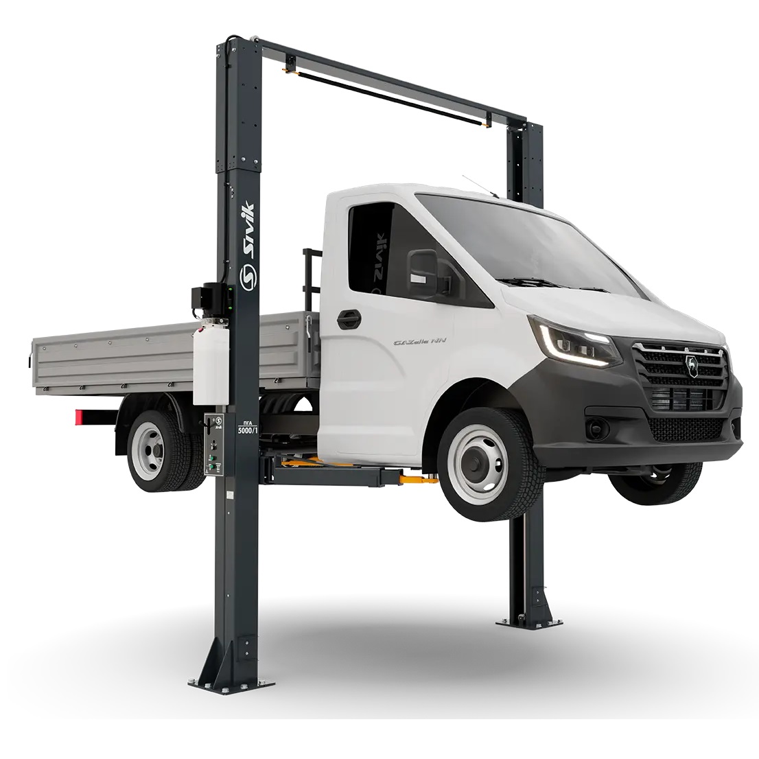 Подъемник двухстоечный ПГА-5000/1 предназначен для подъема легковых автомобилей, микроавтобусов, «джипов» и легких грузовиков типа «Газель» общей массой до 5 т. Электроуправление подъема и опускания. Стационарный, гидравлический.